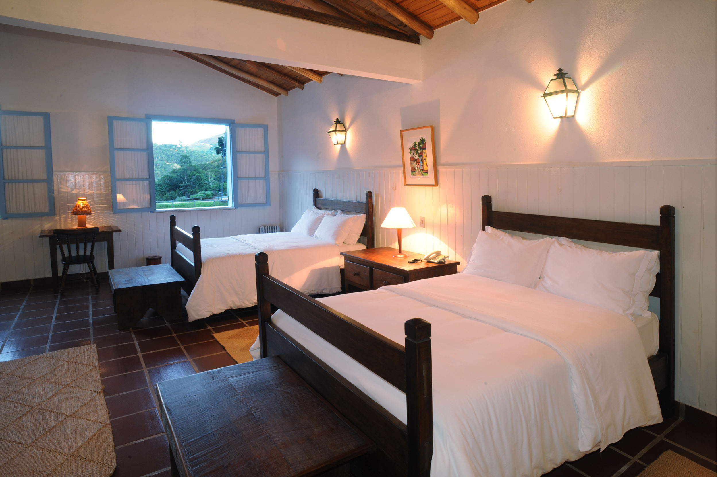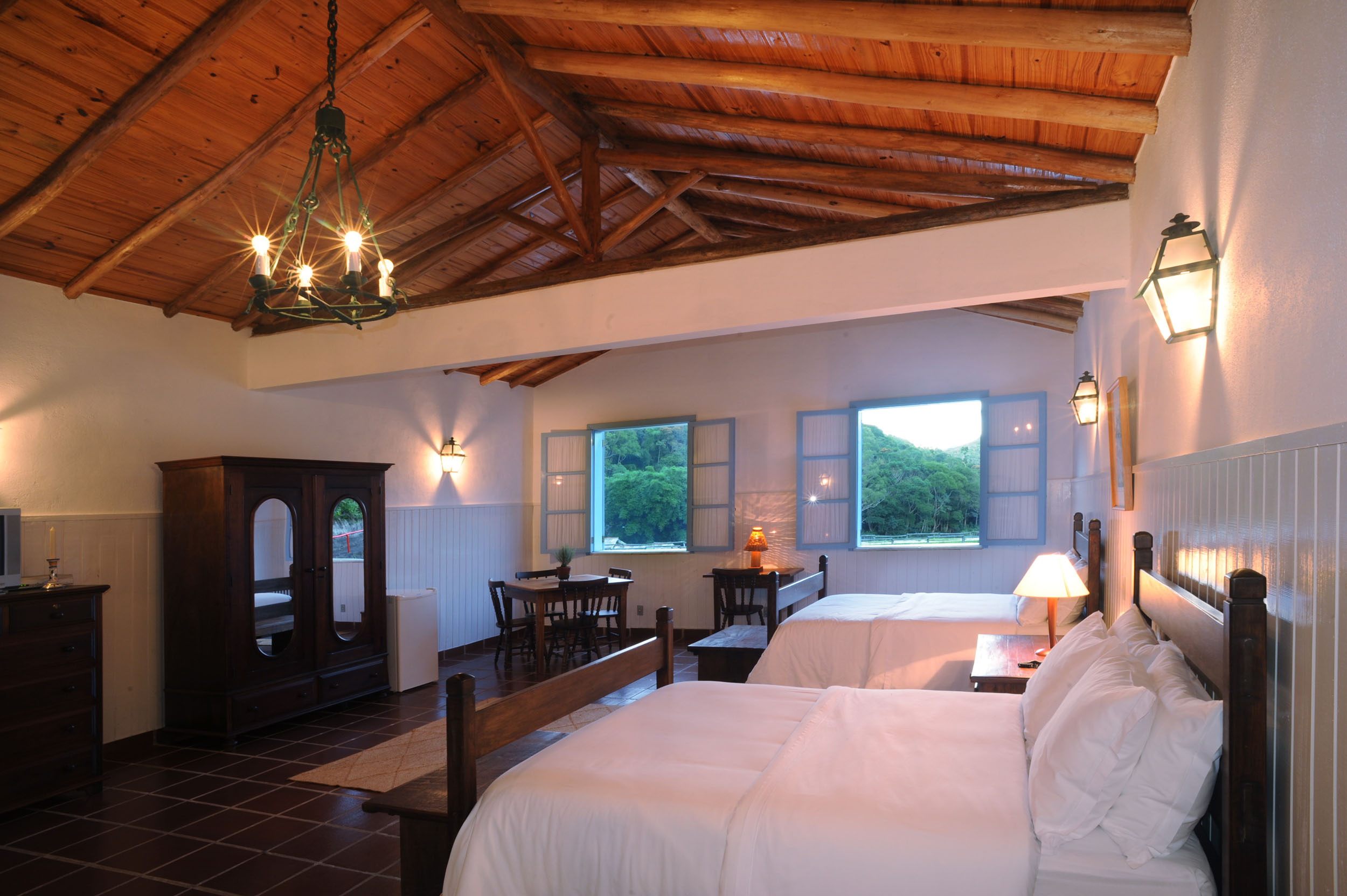 Localizado em frente ao lago é espaçoso e confortável. Com duas camas de casal, sofá, poltronas, TV com SKY e ainda frigobar, lareira e aquecedores de ambiente. O banheiro é espaçoso, abastecido com a água puríssima que nasce na propriedade que é aquecida por boiler elétrico e tem como atração uma banheira antiga.