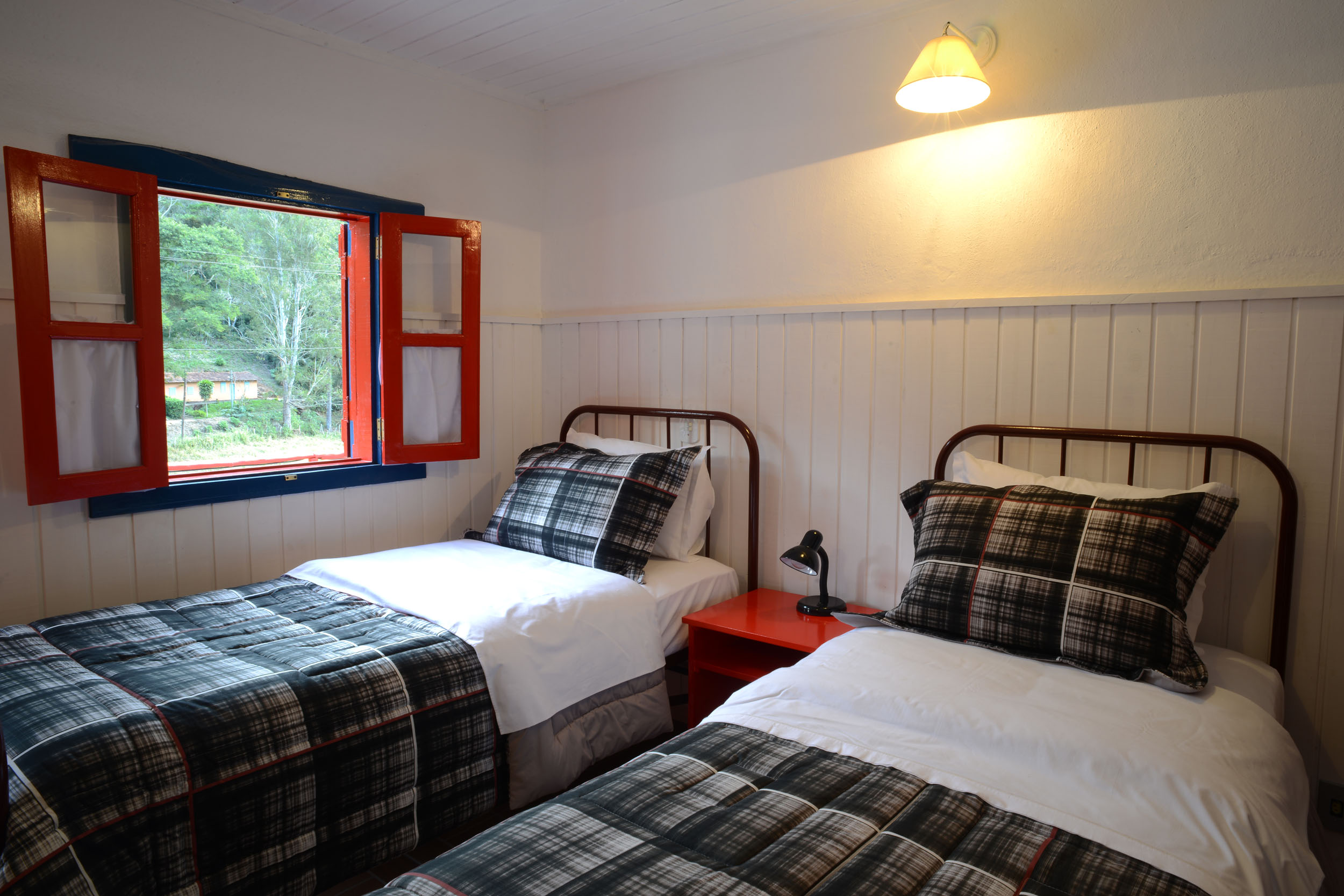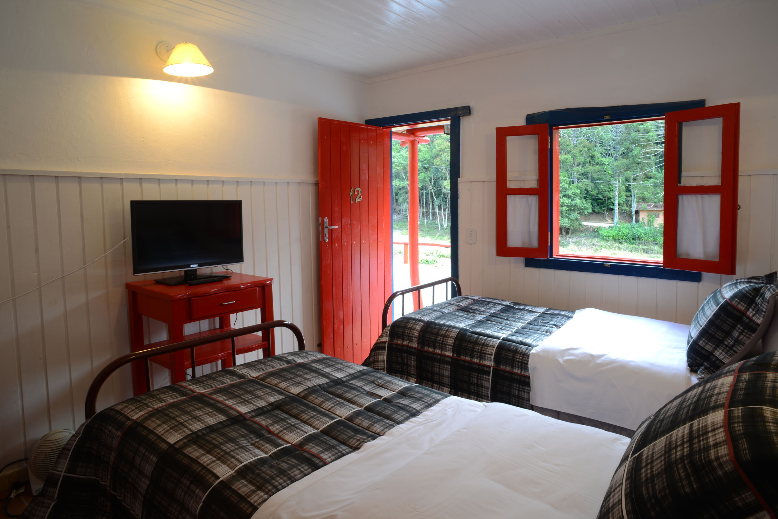 Antiga casa de colono transformada num charmoso chalé colorido de vermelho e branco, ao estilo das antigas casas brasileiras. É aconchegante e muito confortável, com duas camas de solteiro antigas, de ferro, de origem familiar, TV com Sky, frigobar e aquecedor de ambiente. O banheiro é abastecido com a água puríssima que nasce na propriedade, aquecida por boiler elétrico.