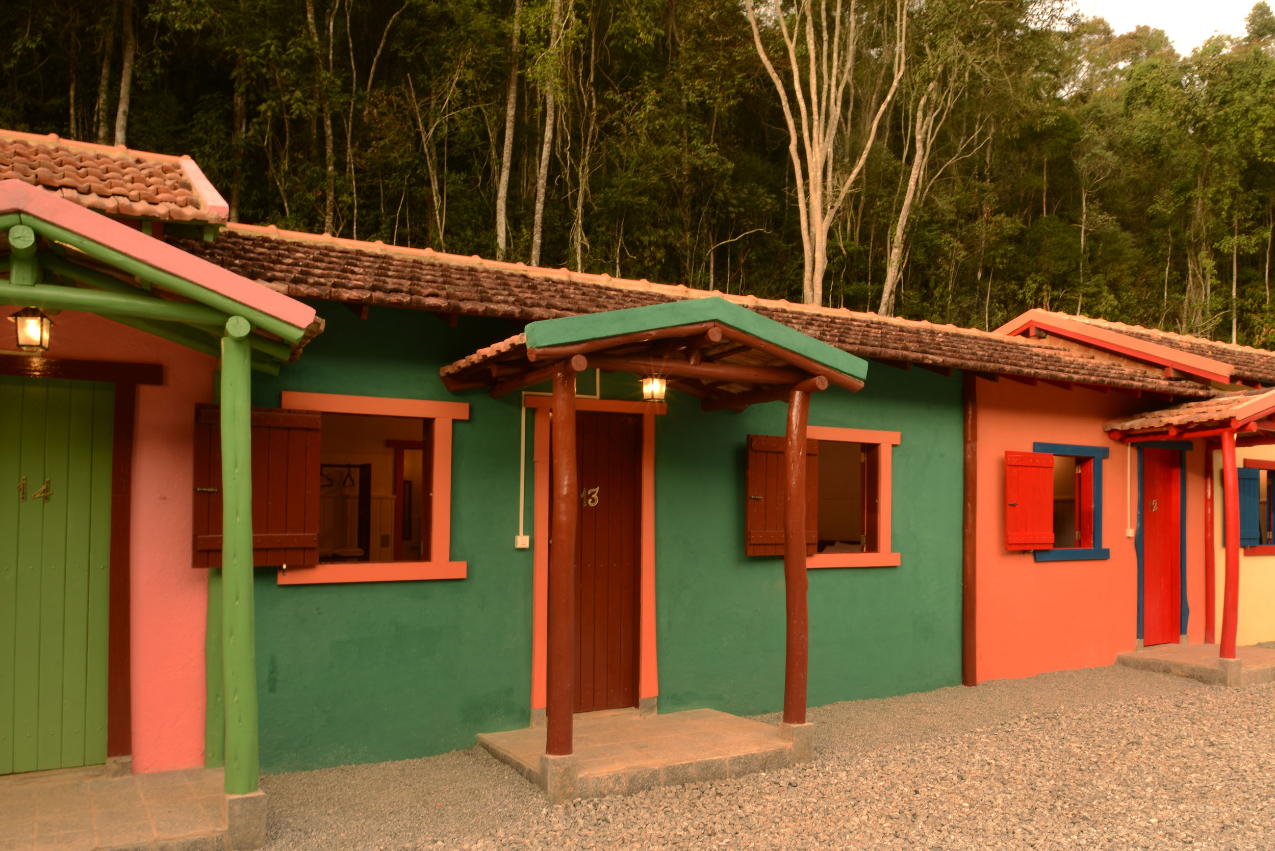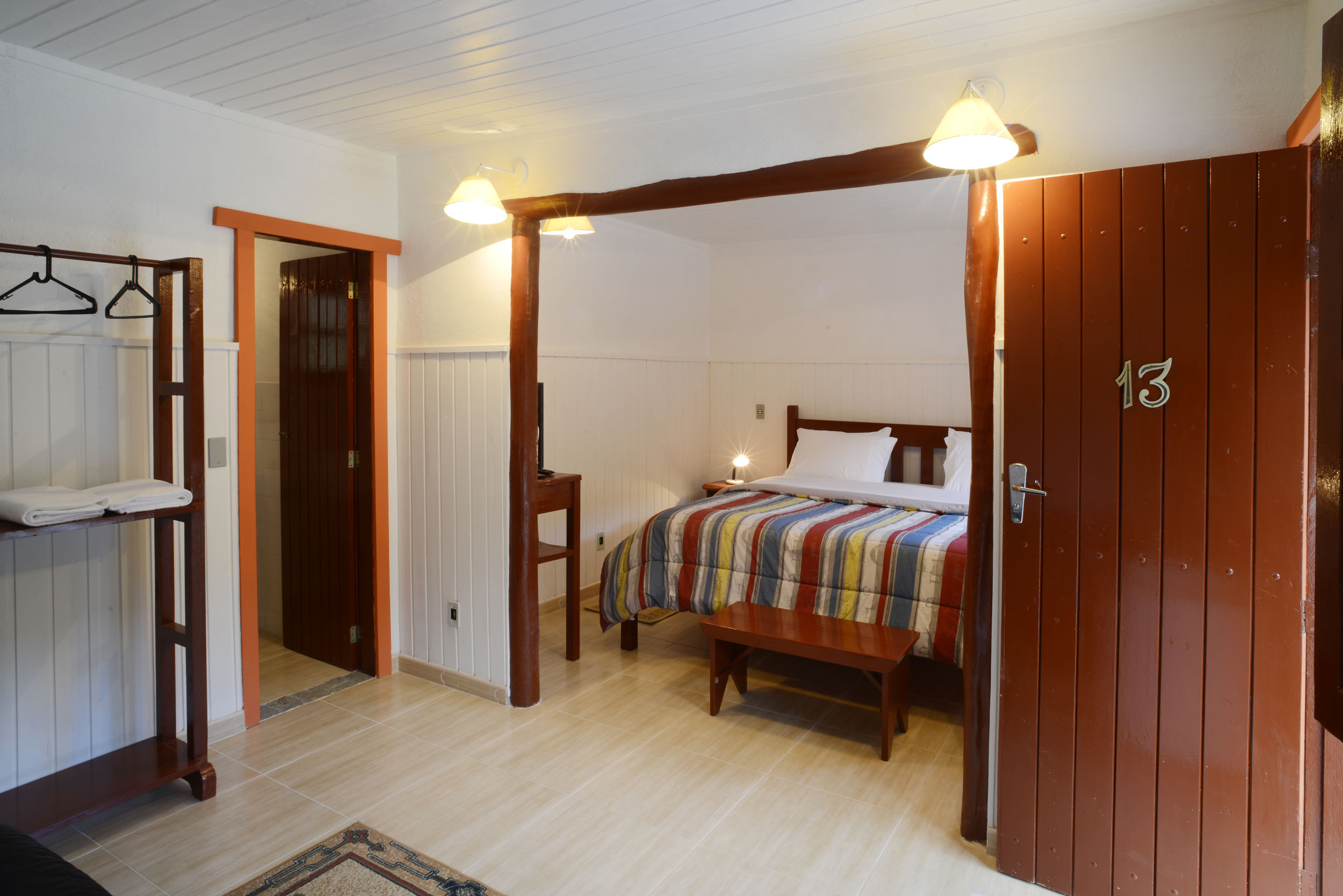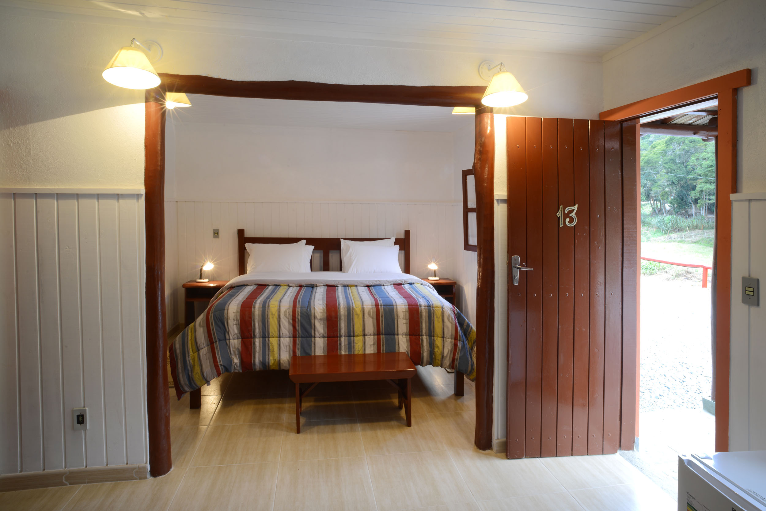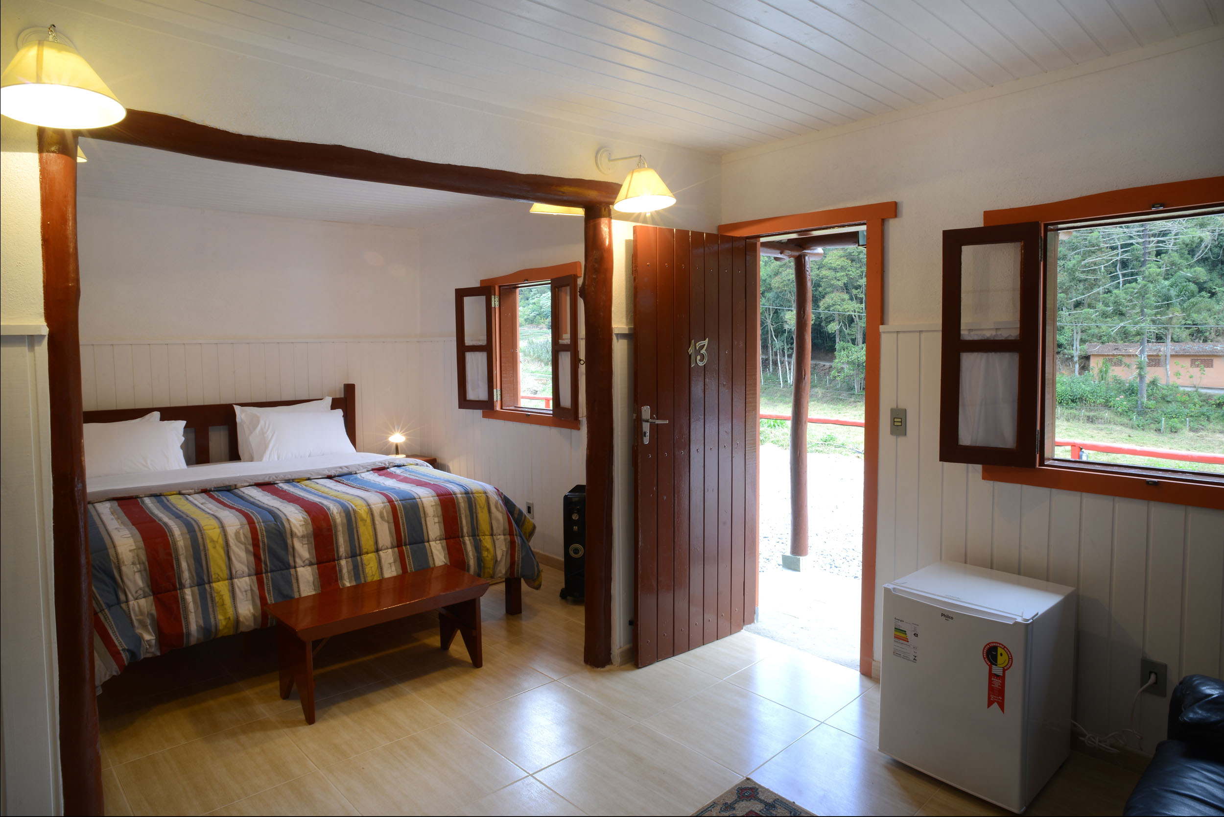 Antiga casa de colono foi transformada num charmoso chalé colorido de marrom e branco ao estilo das antigas casas brasileiras. É amplo e muito confortável, oferece uma espaçosa cama de casal, frigobar, TV com Sky, aquecedor de ambiente e um grande sofá. O banheiro é abastecido com a água puríssima que nasce na propriedade, aquecida por boiler elétrico.