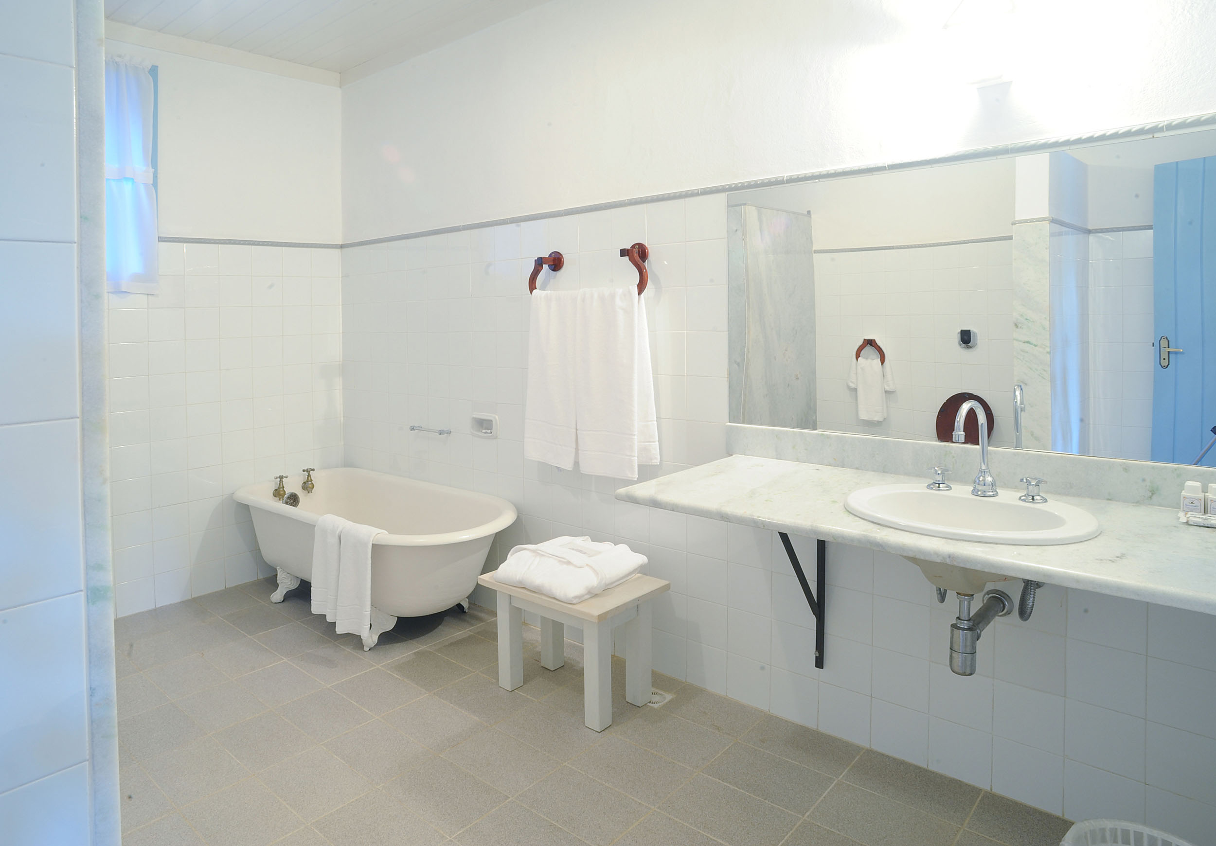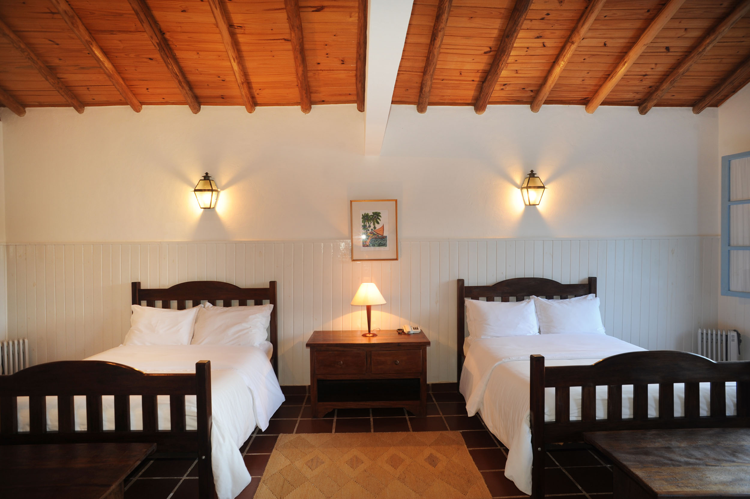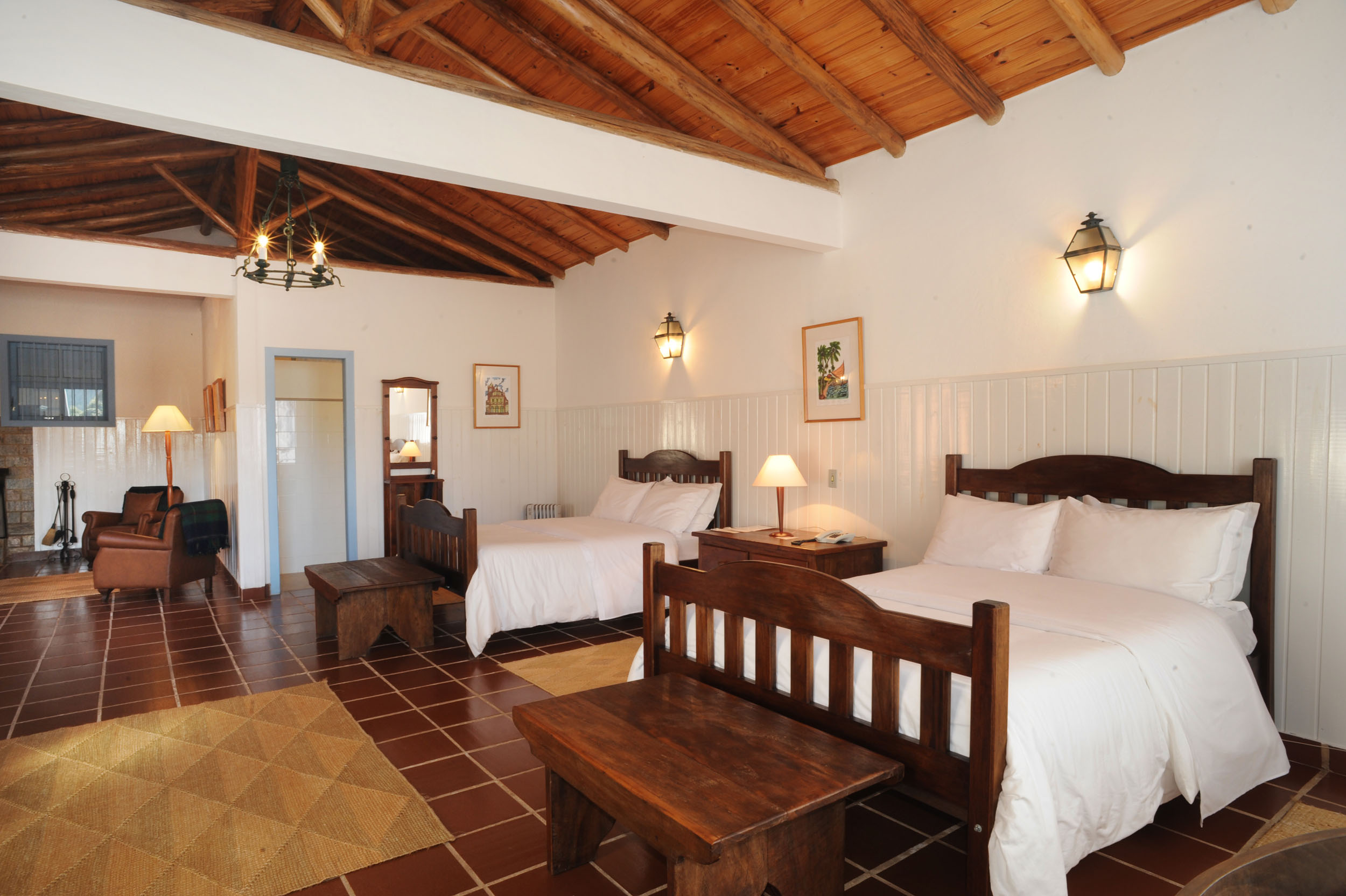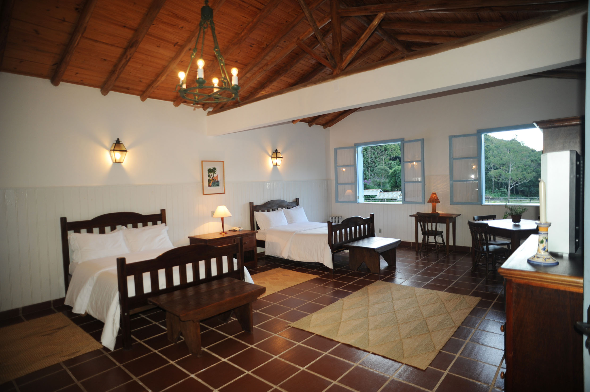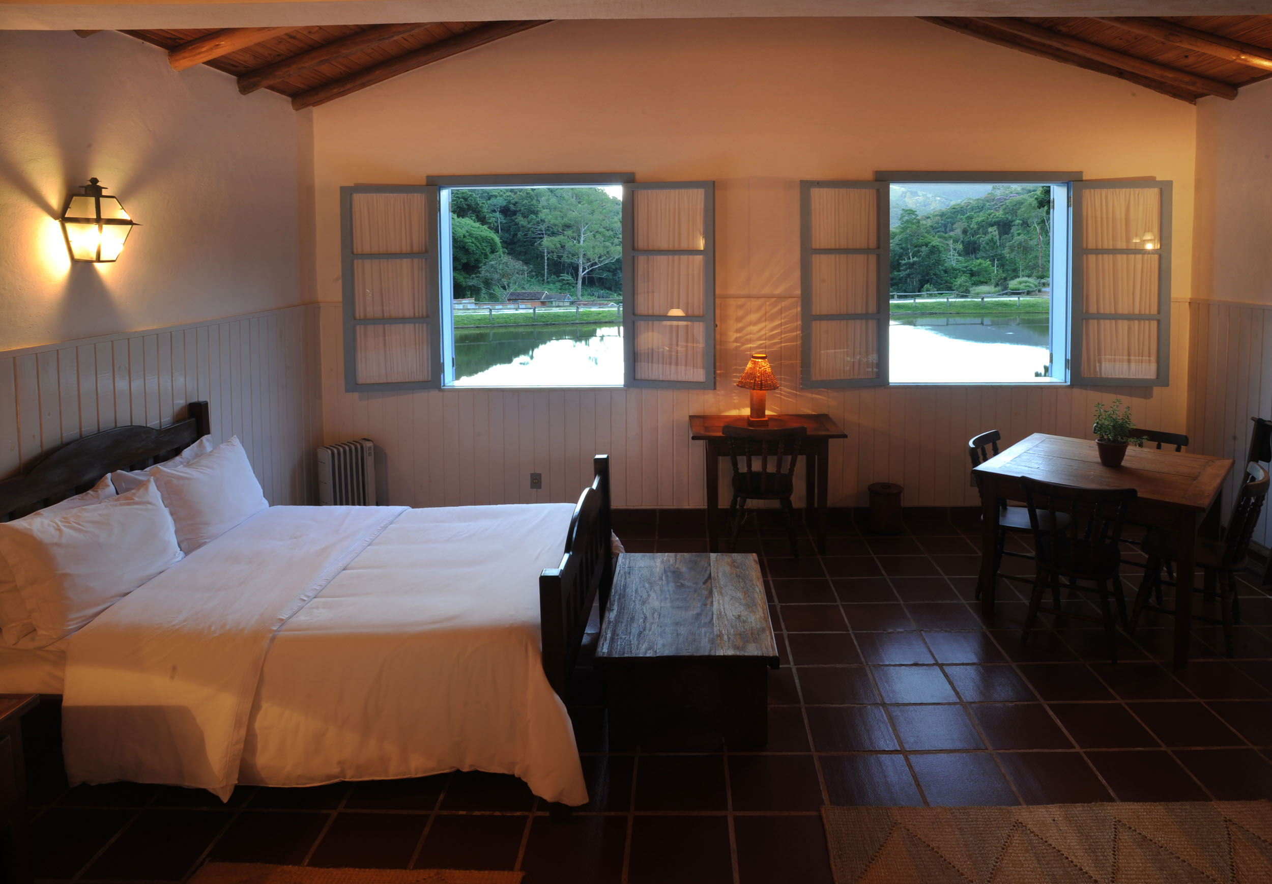 Localizado em frente ao lago é espaçoso e confortável. Com duas camas de casal, sofá, poltronas, TV com SKY e ainda frigobar, lareira e aquecedores de ambiente. O banheiro é espaçoso, abastecido com a água puríssima que nasce na propriedade que é aquecida por boiler elétrico e tem como atração uma banheira antiga.