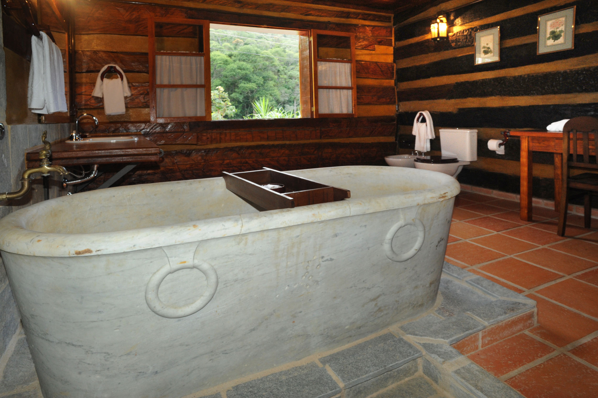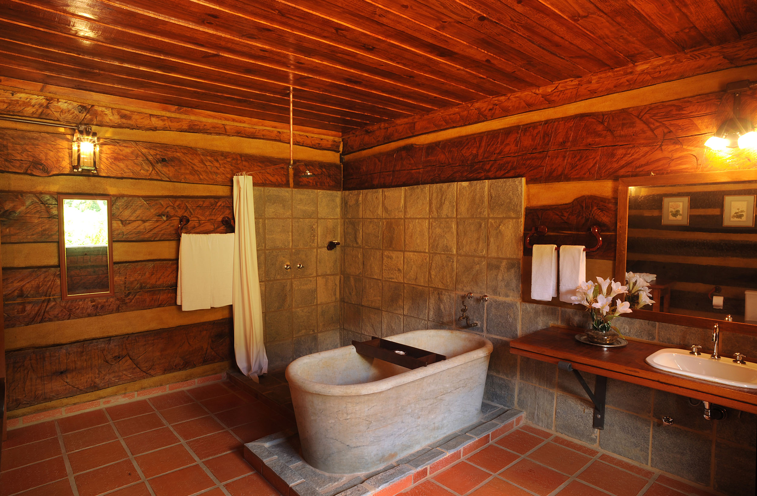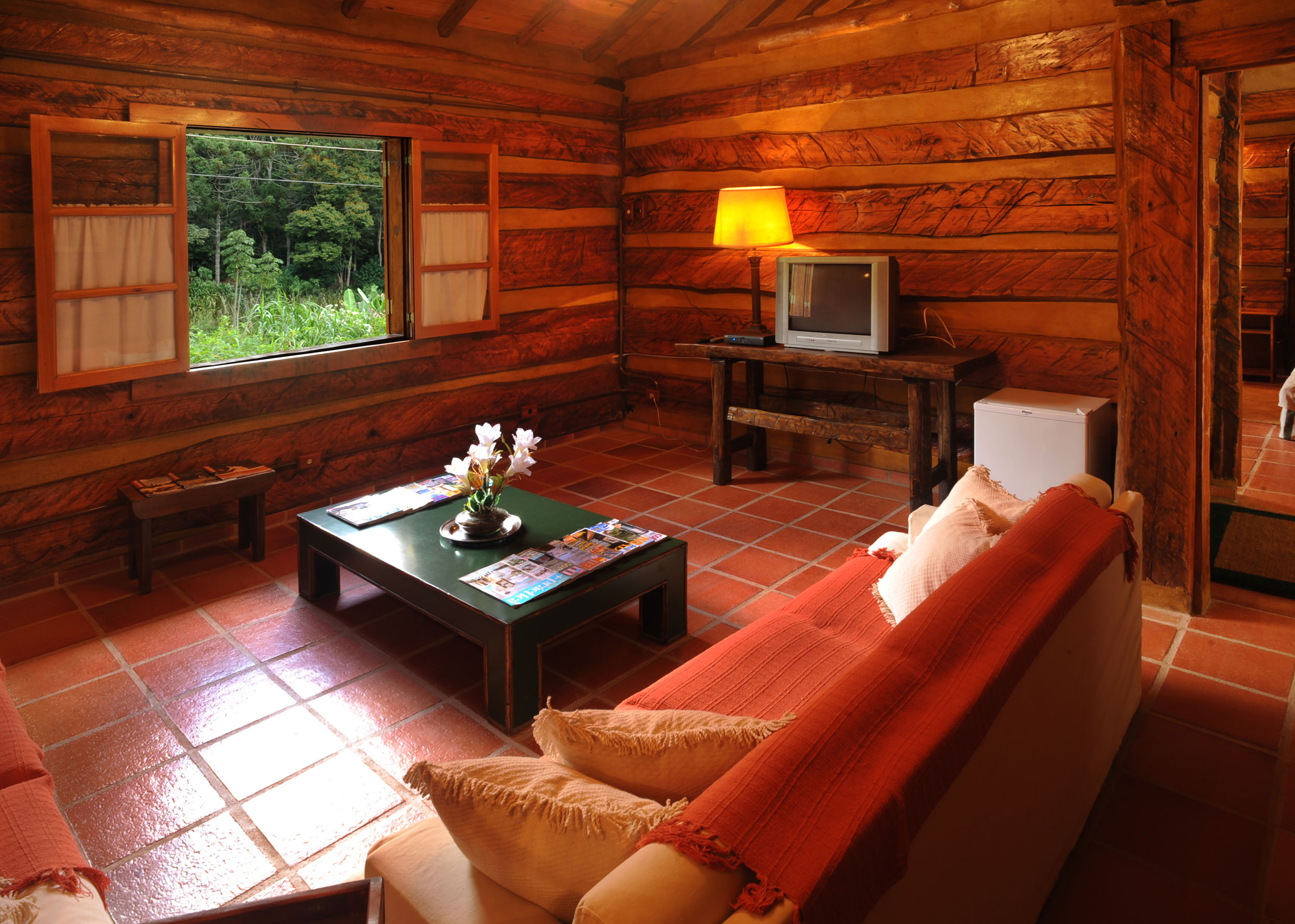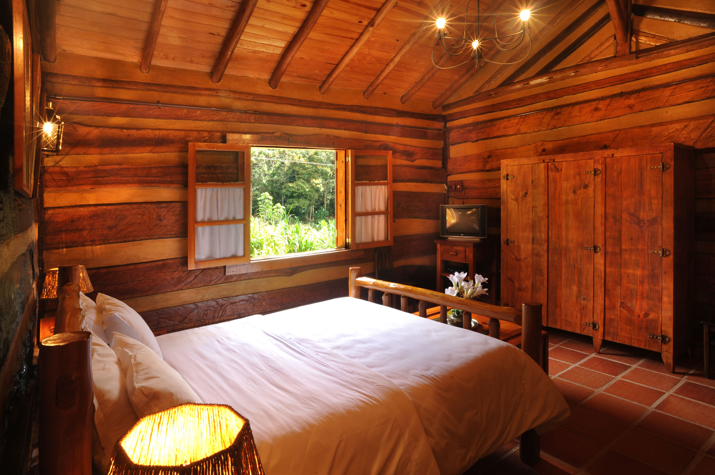 It was built with timber in the style of the old American rustic cabins. Very cozy, spacious and comfortable. All timber furniture was made in local, featuring a queen size bed. The cottage is divided into a bed and a sitting room, in both places you can enjoy TV with SKY service (satellite) and electric heather. In the sitting room you have two sofas a fridge and all you need for your comfort. In the spacious bathroom, supplied with the pure water spring locally and heated by electric boiler, features an antique Italian bath sculpted in one single piece of marble.