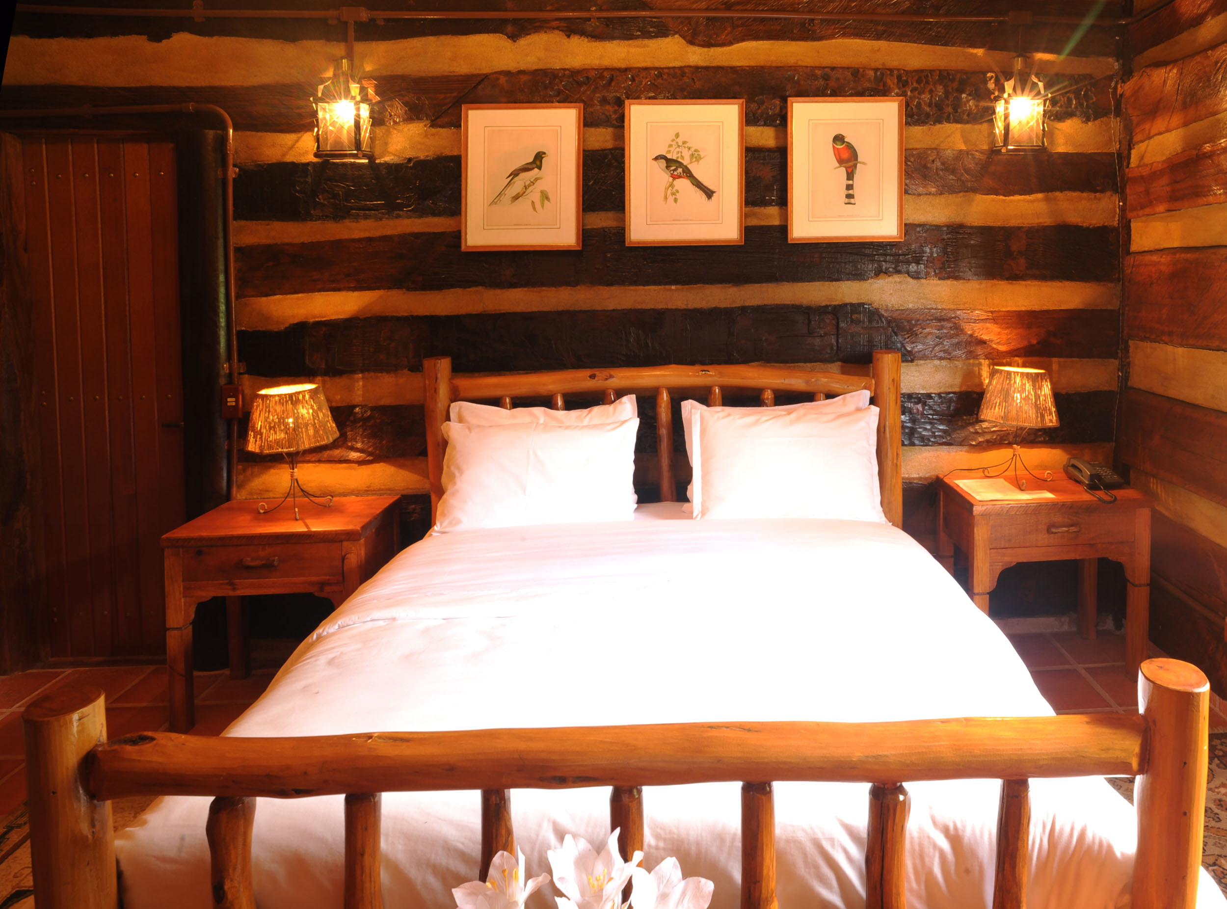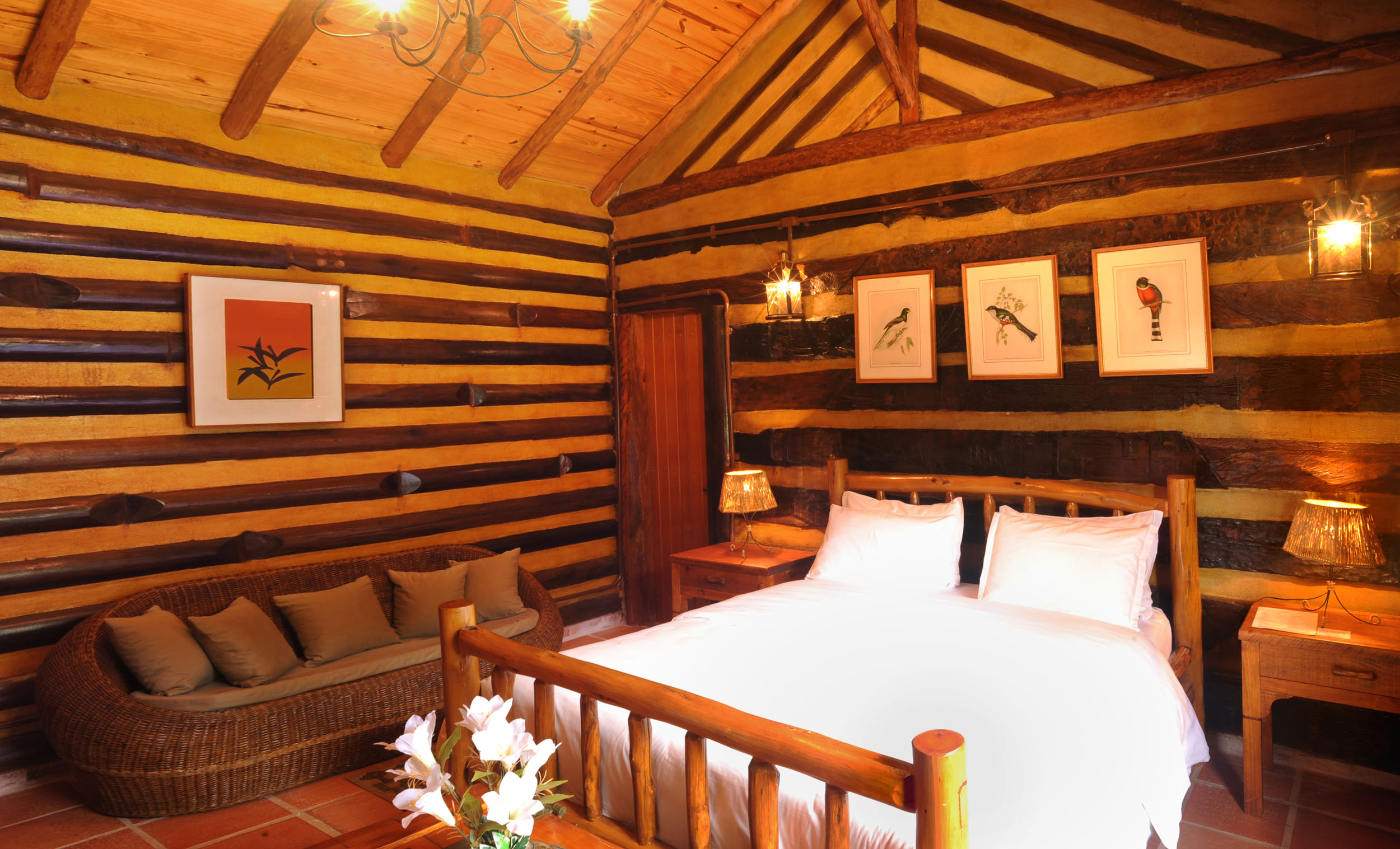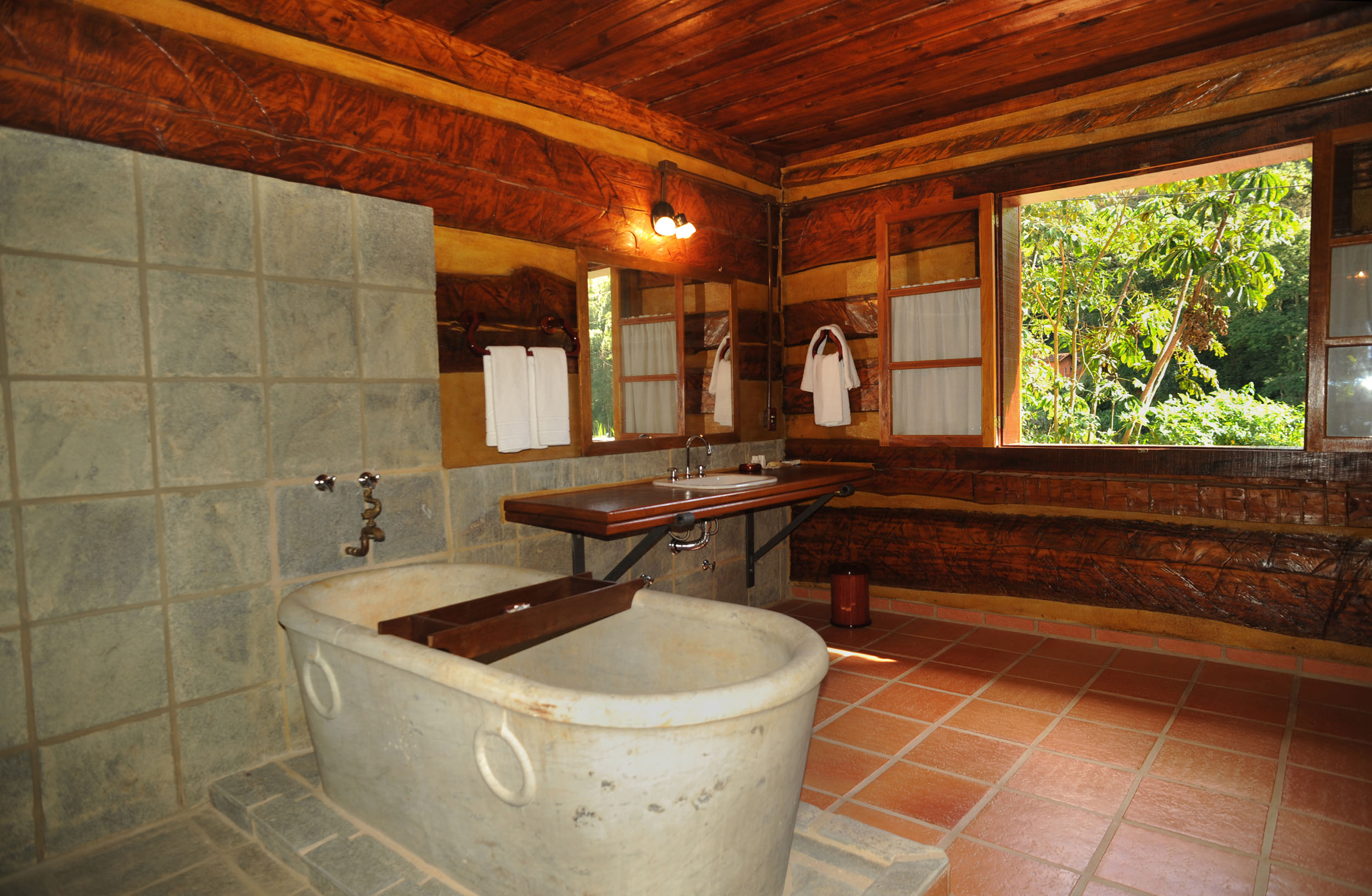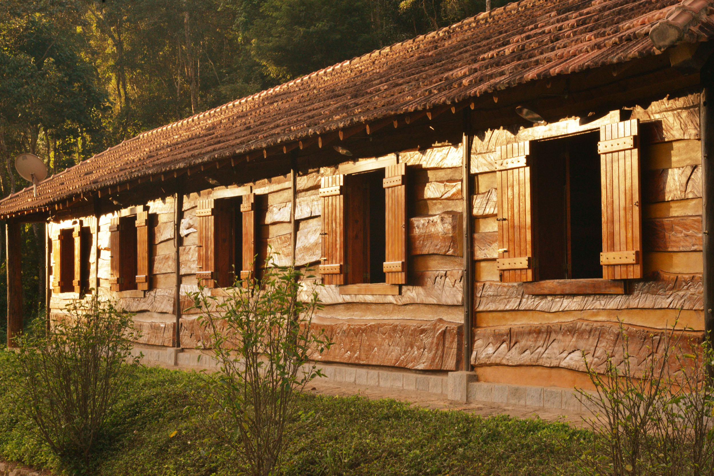 It was built with timber in the style of the old American rustic cabins. Very cozy, spacious and comfortable. All timber furniture was made in local, featuring a queen size bed. The cottage is divided into a bed and a sitting room, in both places you can enjoy TV with SKY service (satellite) and electric heather. In the sitting room you have two sofas a fridge and all you need for your comfort. In the spacious bathroom, supplied with the pure water spring locally and heated by electric boiler, features an antique Italian bath sculpted in one single piece of marble.