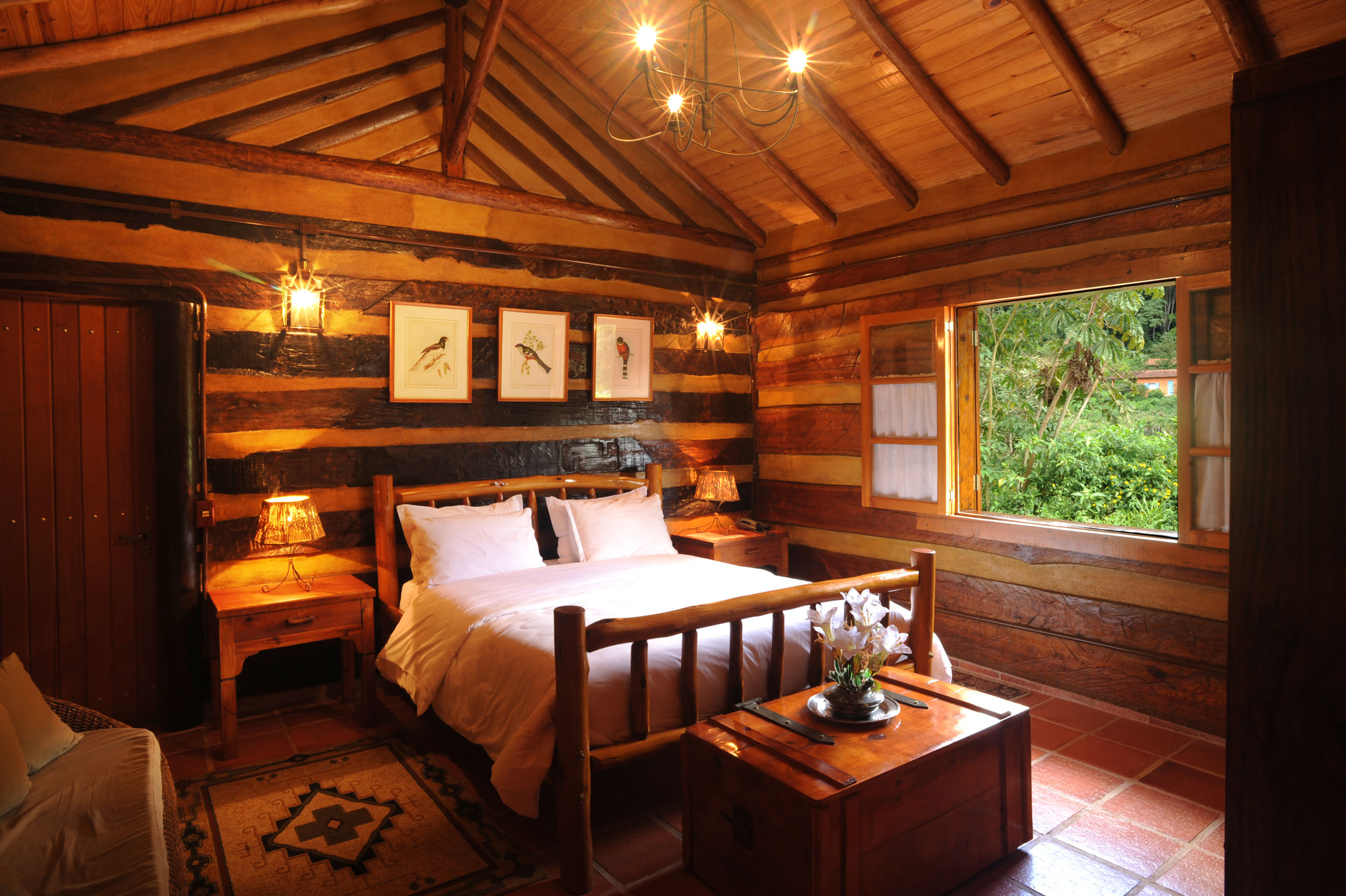 Construído com madeira maciça no estilo das rústicas cabanas americanas. Muito aconchegante e confortável. Todo o mobiliário de madeira foi fabricado na propriedade. No quarto chama atenção pela sua simplicidade rústica, a cama “queen size.” O Chalé é dividido em duas peças, quarto e sala, em ambos os ambientes , você encontrará TV com SKY e aquecedores elétricos de ambiente e na sala dois sofás, frigobar e tudo o mais que você precisa para o seu conforto. No espaçoso banheiro, abastecido com a água puríssima que nasce na propriedade, aquecida por boiler elétrico, chama atenção à beleza da antiga banheira italiana, esculpida em um único bloco de mármore.