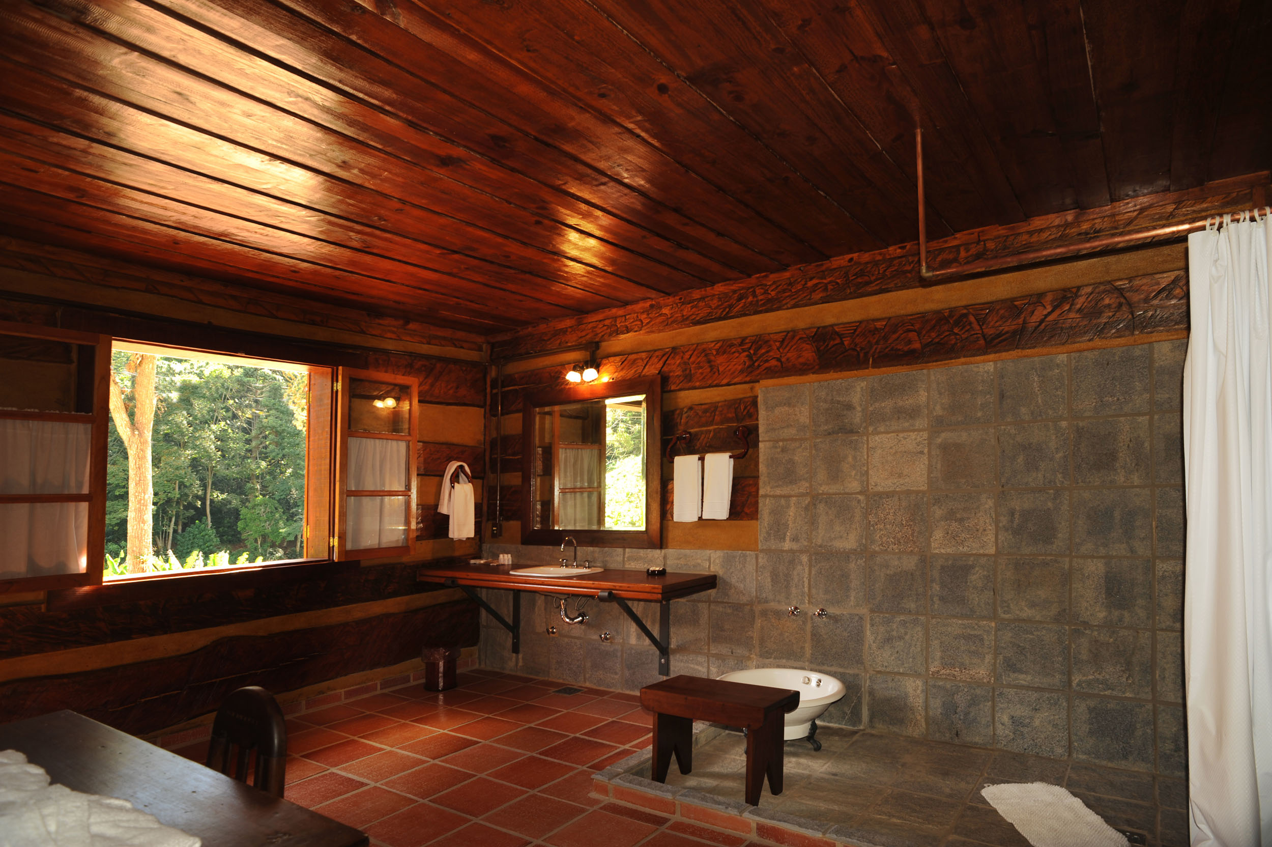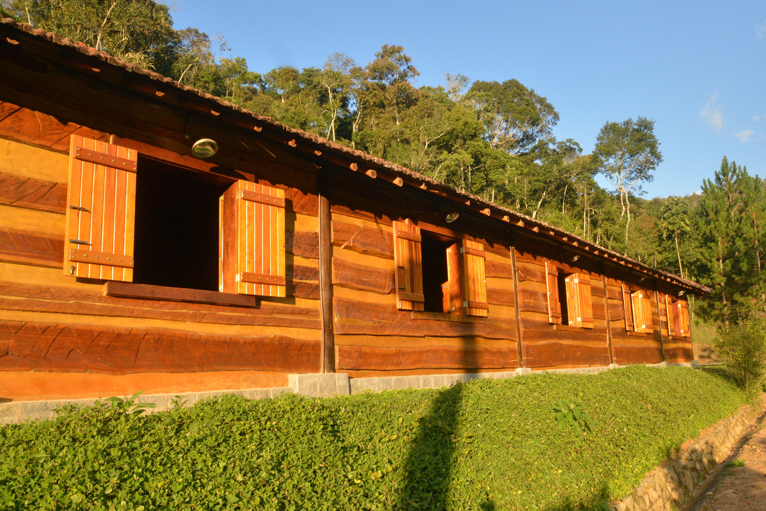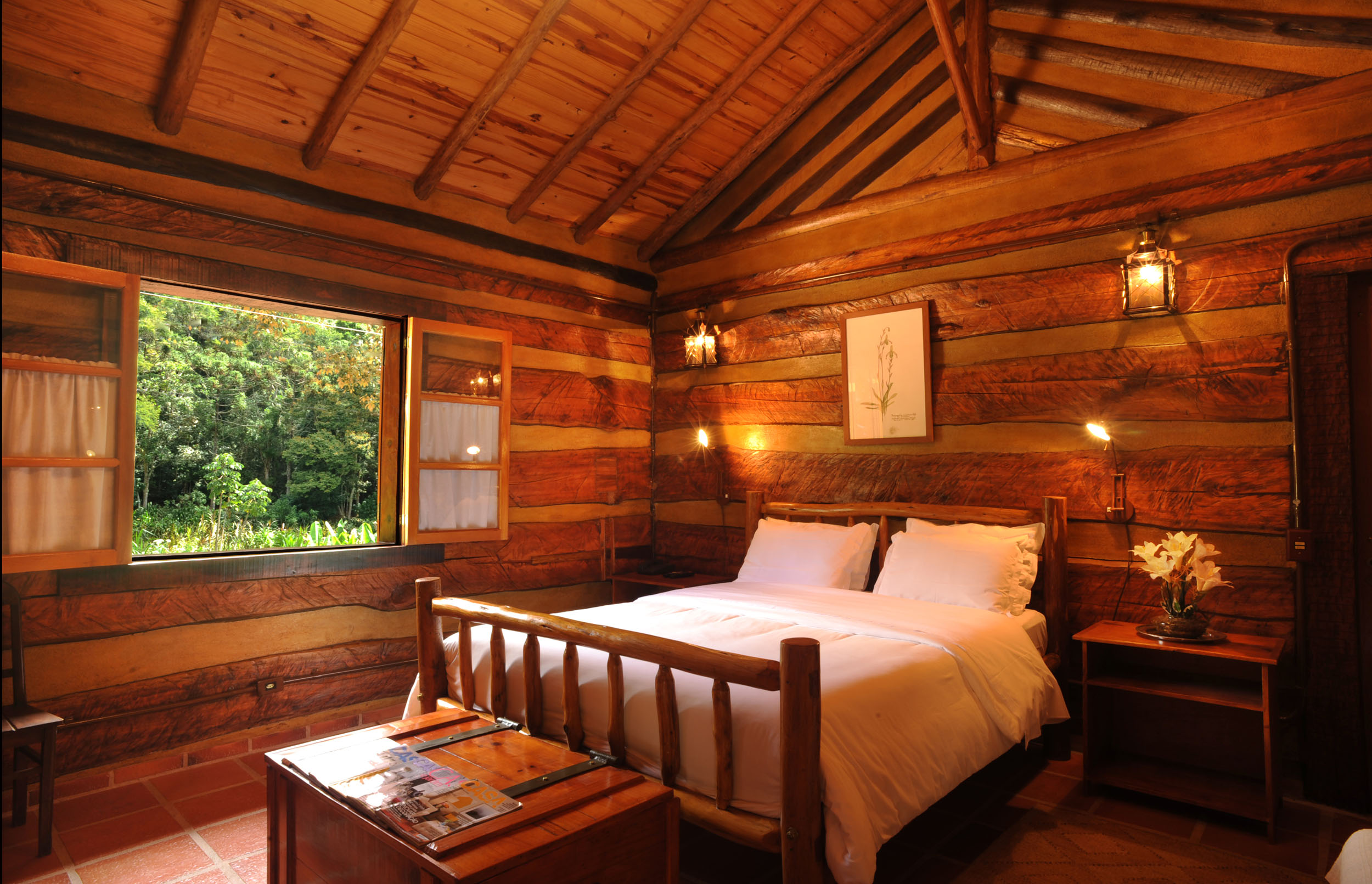 It was built with timber in the style of the old American cabins. Very cozy, spacious and comfortable. All timber furniture was made in local, featuring a queen size bed. It offers electric heather, TV with SKY service (satellite) and a fridge. In the spacious bathroom, supplied with the pure water spring locally and heated by electric boiler, features an antique basin used to dip feet, for relaxation and consequent sensation of rest.
