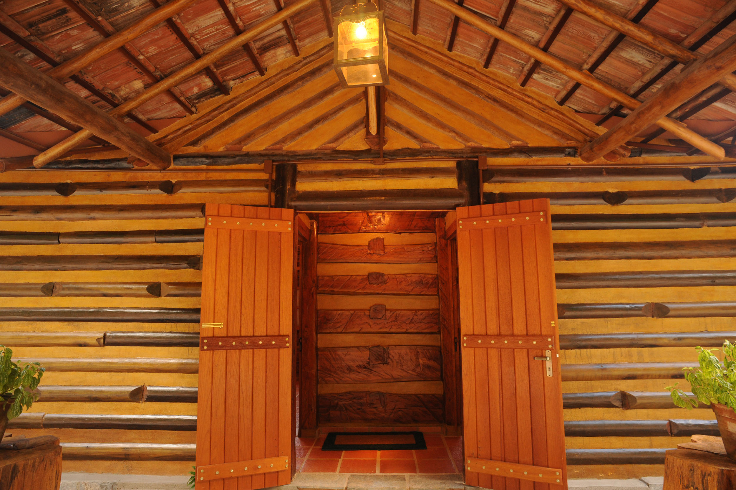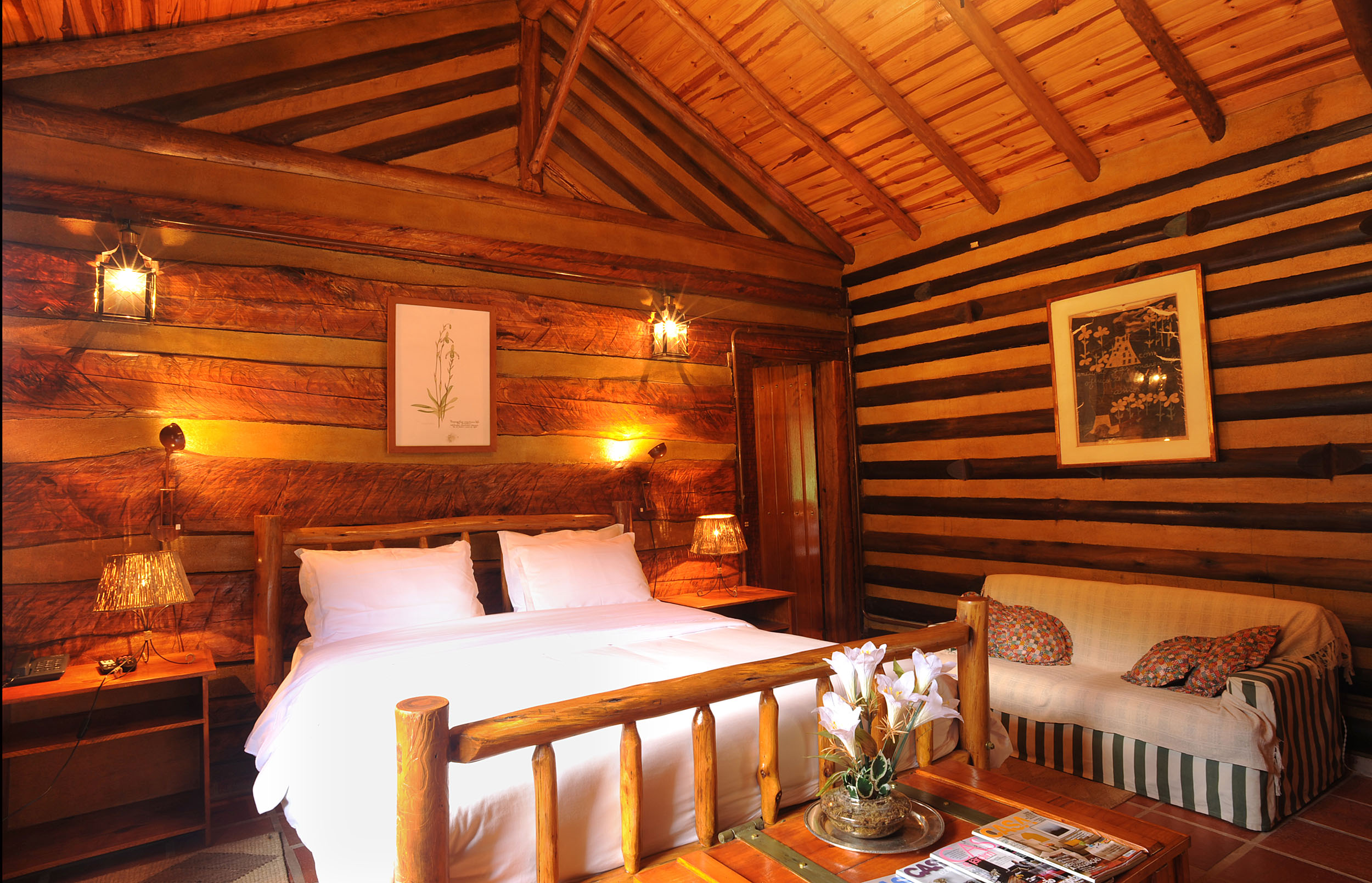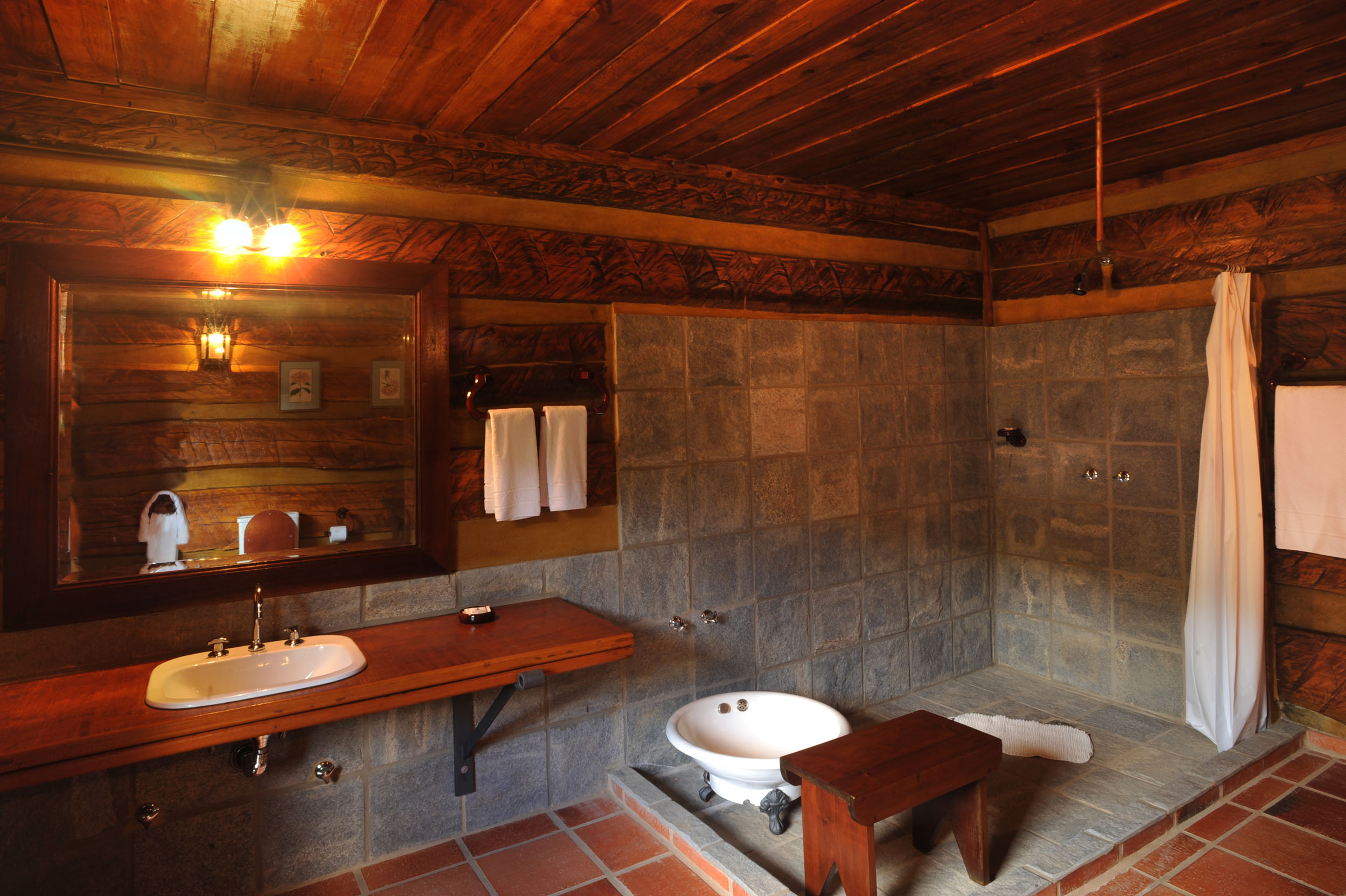 It was built with timber in the style of the old American cabins. Very cozy, spacious and comfortable. All timber furniture was made in local, featuring a queen size bed. It offers electric heather, TV with SKY service (satellite) and a fridge. In the spacious bathroom, supplied with the pure water spring locally and heated by electric boiler, features an antique basin used to dip feet, for relaxation and consequent sensation of rest.